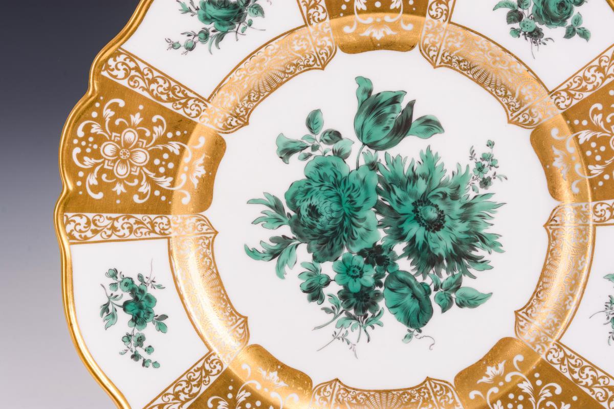 Prunkteller mit kupfergrüner Blumenmalerei. Meissen.