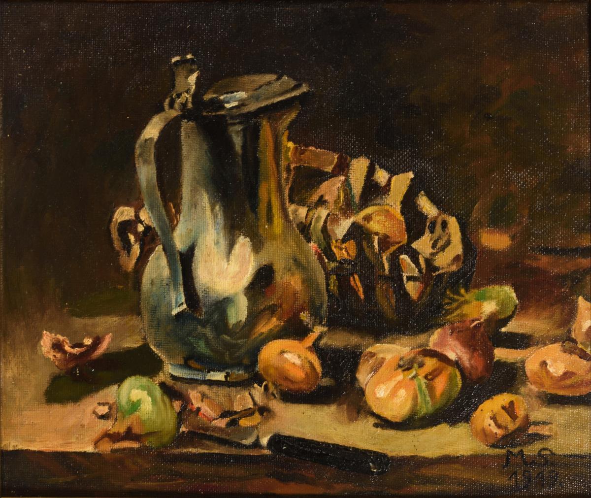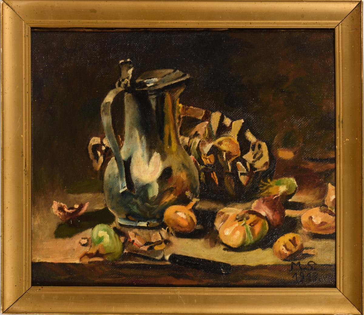 Stillleben mit Zinnkanne neben Zwiebeln. Minimale Altersspuren.