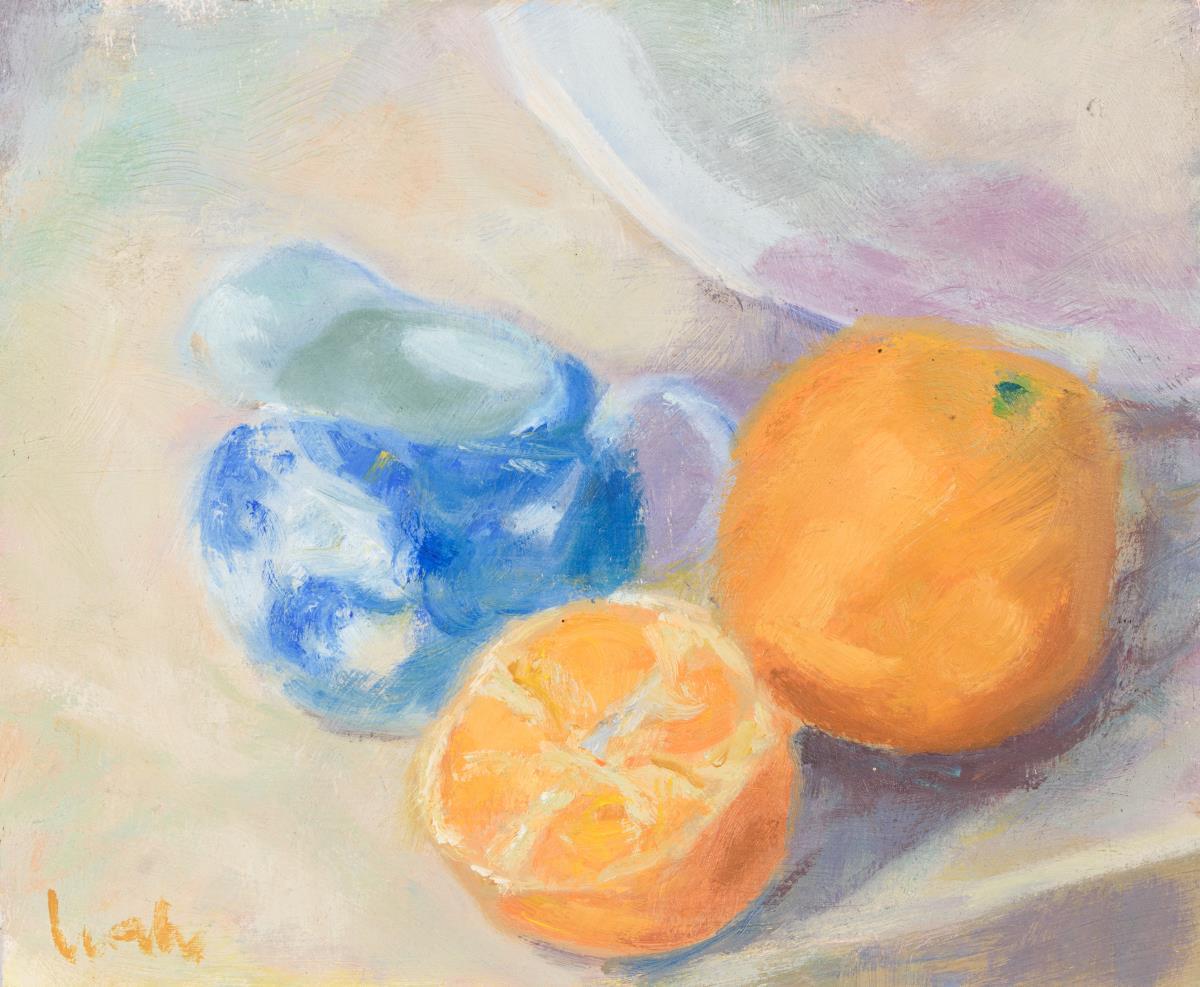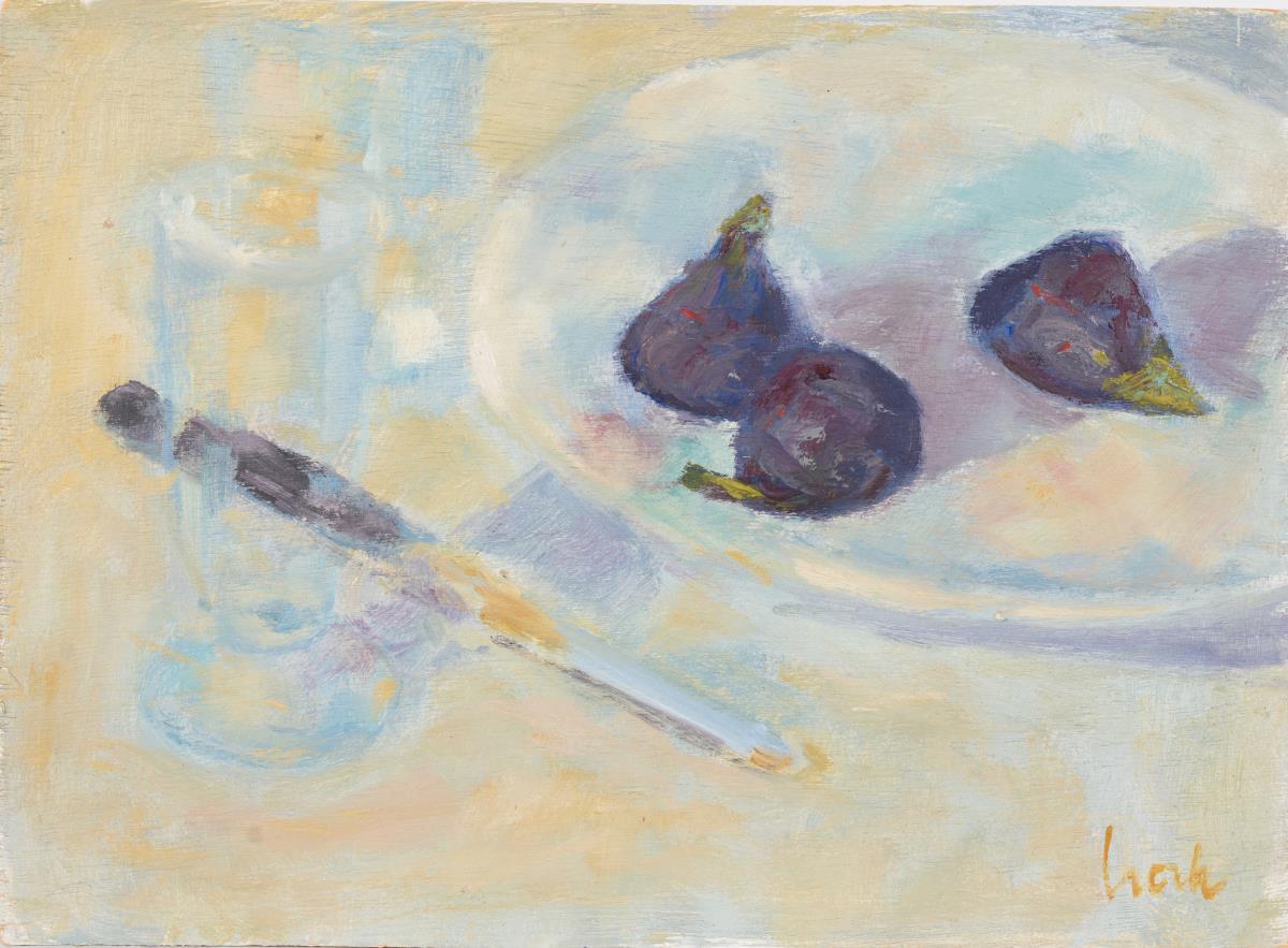 Stillleben mit Orangen sowie Feigen auf einem Teller neben Glas und Messer.
