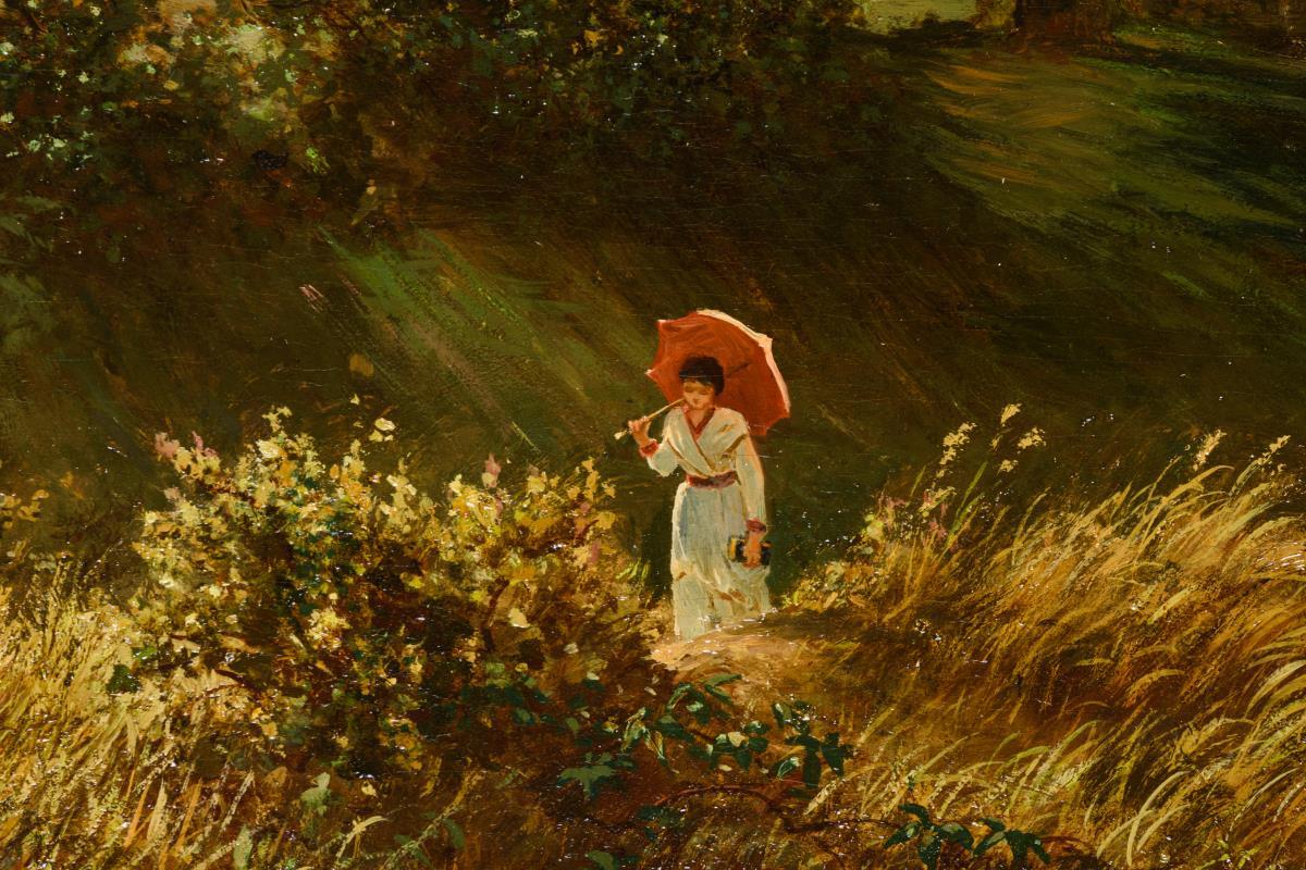 Dame mit Sonnenschirm auf den Hügeln nahe dem Bauernhaus am Seeufer.