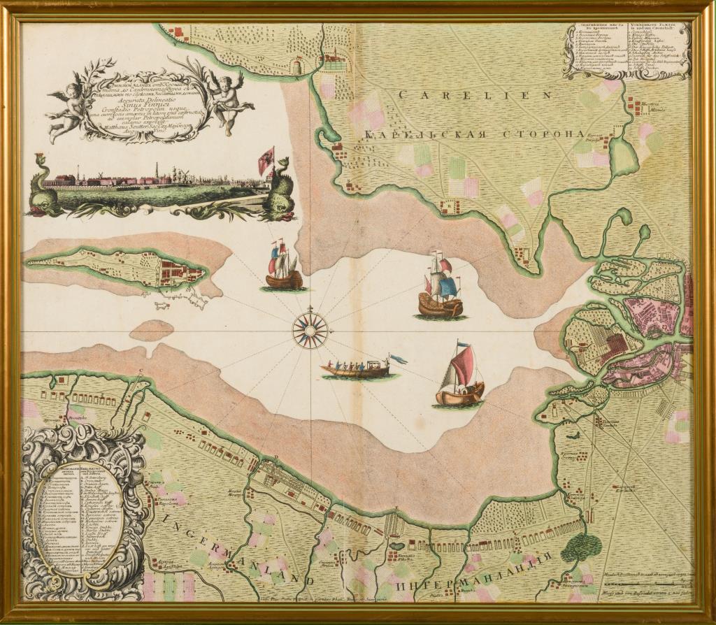 Landkarte des Finnischen Meerbusens am Rande von Karelien und Ingermanland, historischen Landschaften in Nordosteuropa; Titelkupfer in russischer und lateinischer Sprache: "Accurata Delineatio Sinus Finnici [...], ausführliche Legende. Bugfalte, Knicke.