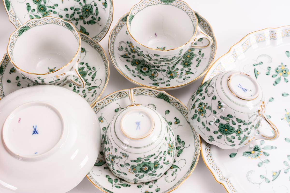 25 Teile. Form "Neuer Ausschnitt". Kaffeekanne (H 23 cm), 2 Milchkännchen (H 8,5 und 12 cm), Zuckerdose, 6 Kaffeetassen, 6 Untertassen, 6 Kuchenteller, 1 Tablett (L 28,5 cm), 1 Durchbruchschale (Ø 18,5 cm), 1 Stövchen mit Brenner. 1 Blatt am Deckelknauf der Kanne restauriert, geklebter Chip am Stand des Stövchens.