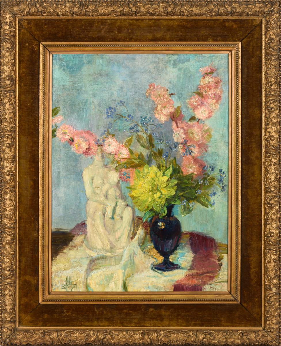 Monogrammist: Stillleben mit Blumen und Porzellanfigur