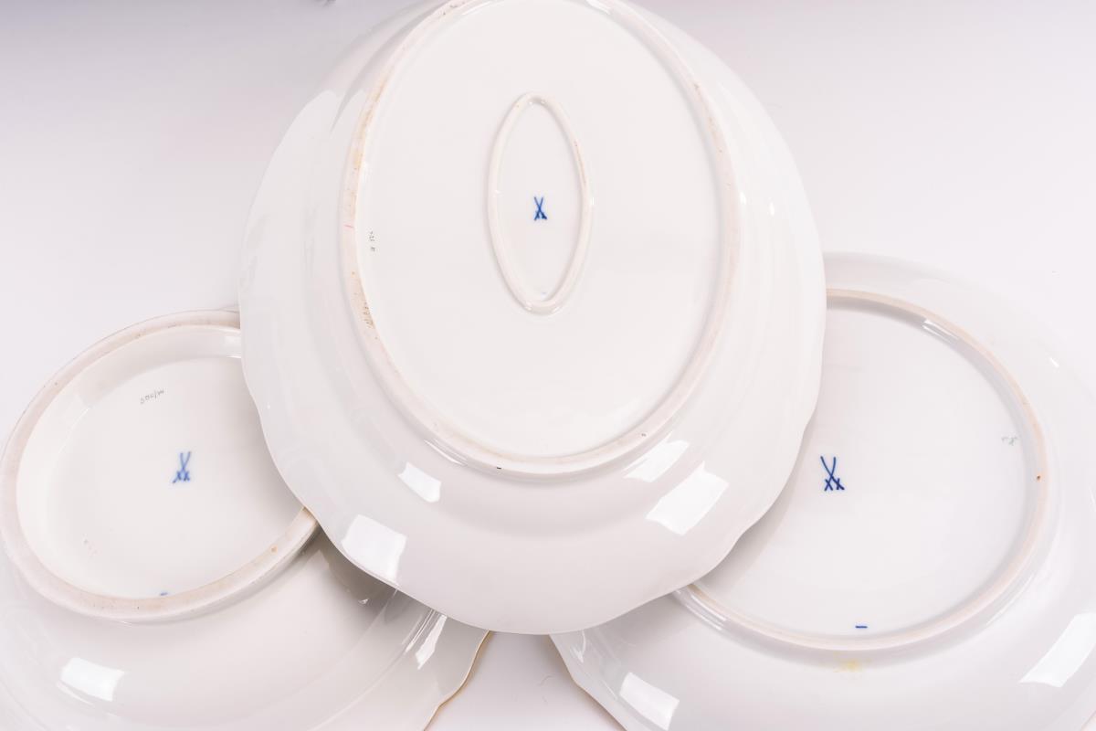Form "Neuer Ausschnitt". Deckelschüssel (Ø 27 cm), Kuchenteller (Ø 27,5 cm) und Ovalplatte (L 35,5 cm).