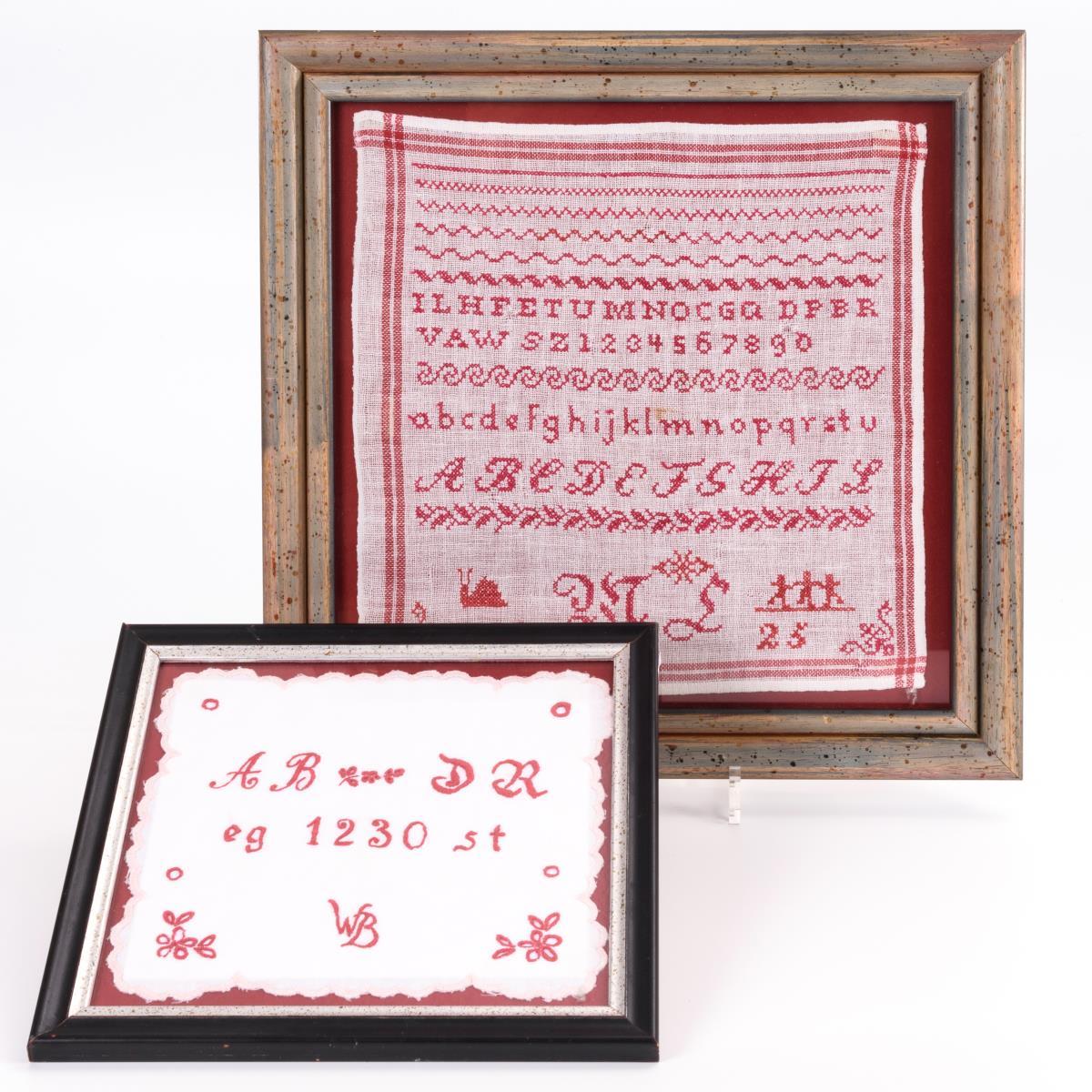 Rote ABC-Stickereien in verglasten Rahmen. 1 datiert 1925. Monogramm ungedeutet.