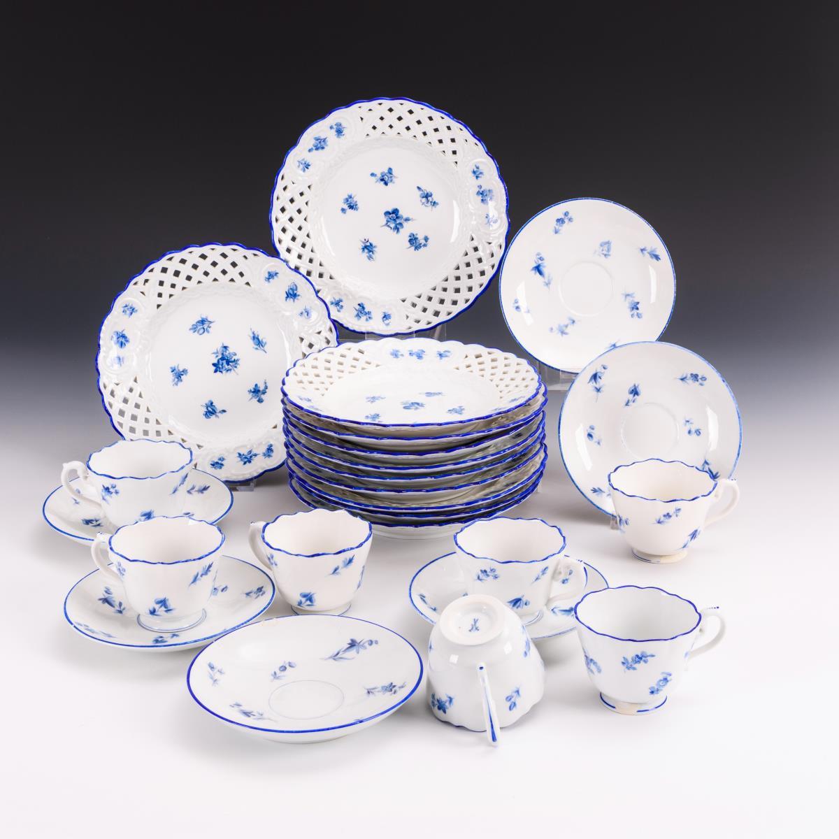 7 Kaffeetassen (H 6 cm), 6 Untertassen (Ø ca. 14,5 cm) und 11 Durchbruchteller (Ø 20 cm). Partiell etwas berieben, 1x geklebter Chip an 1 Untertassenrand.