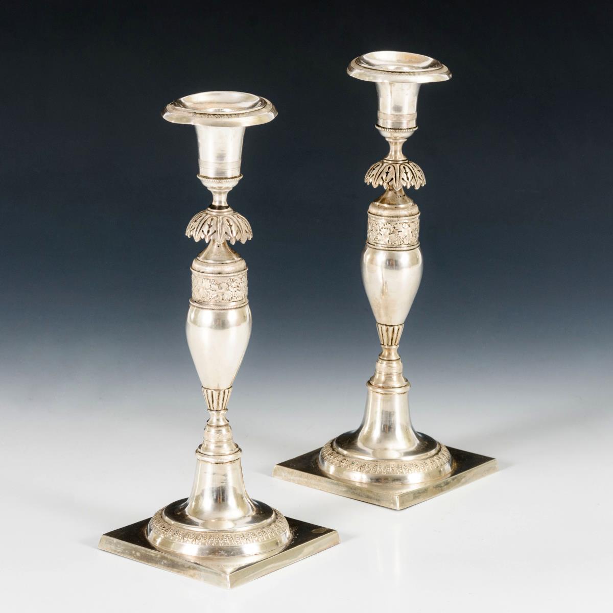 1-flammiges Biedermeier-Leuchterpaar mit reliefiertem Weinlaub und halbplastischem Blattkranz. Auf quadratischer Plinthe. Herausnehmbare Tropfteller stark gedellt.