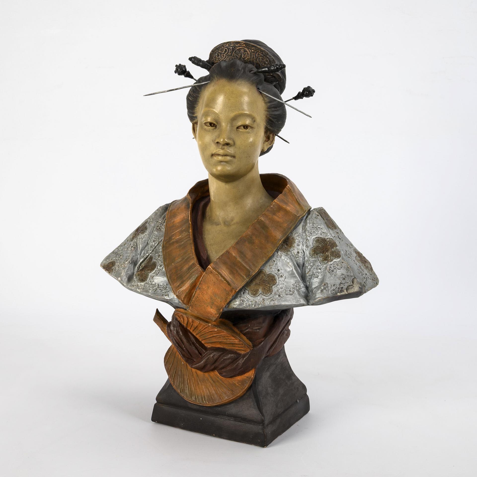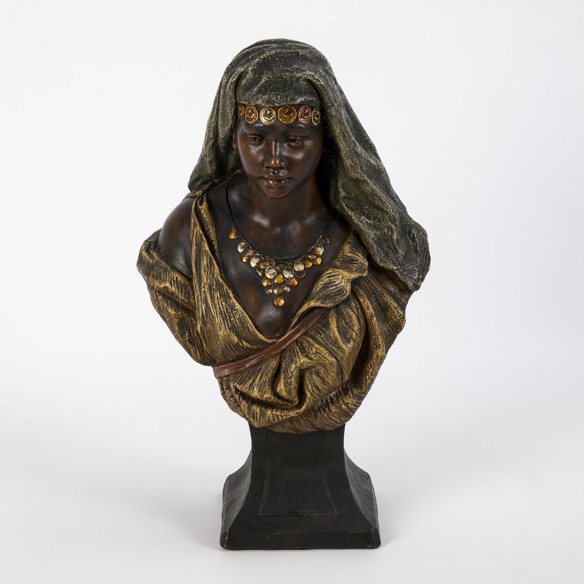 Small Art Nouveau terracotta bust "North African woman with coin chains as head and neck ornaments". Viennese manufactory Friedrich Goldscheider.