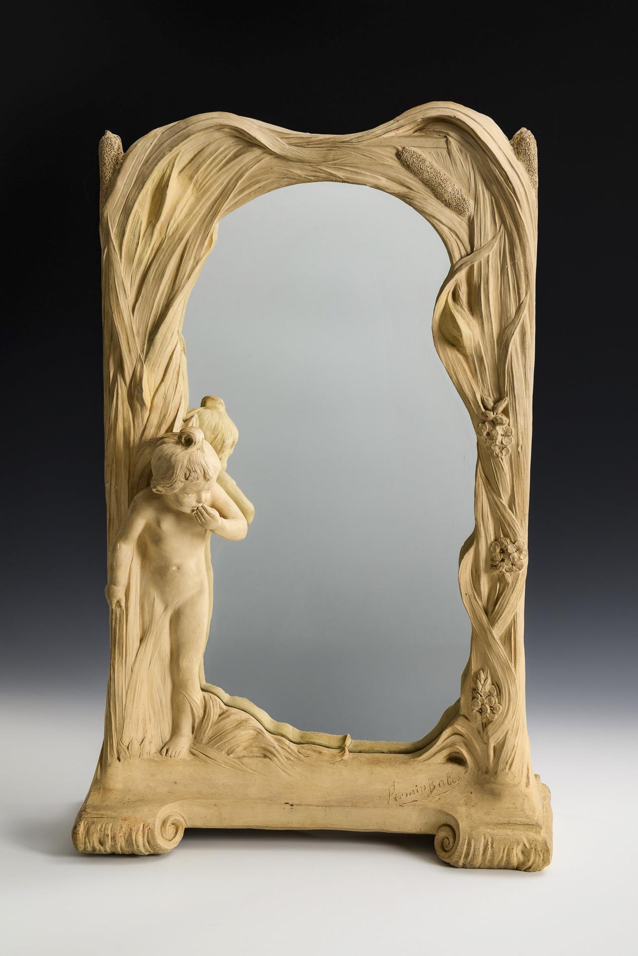 Art Nouveau table mirror with child figure. Viennese manufactory Friedrich Goldscheider.