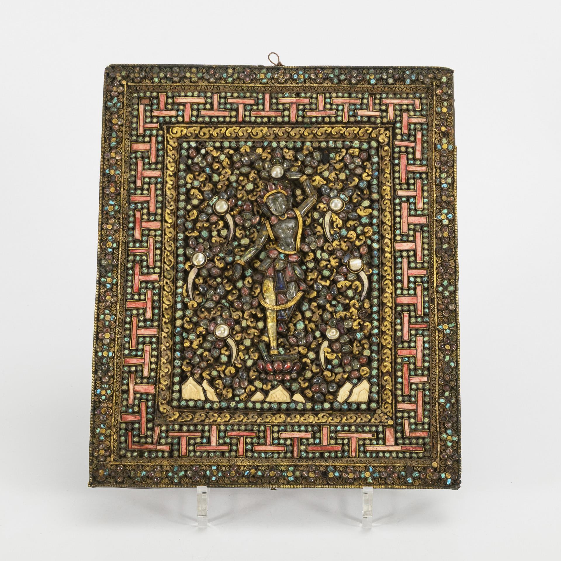 Mosaikplatte mit Göttin. Mitte 19. Jahrhundert. Tibet. 28 x 23 cm. 1,5 kg. Bildplatte mit stehender Buddhafigur, zusammengesetzt aus verschiedenfarbigen, einzeln gefassten Glassteinen sowie Bein, Perlen und Türkisen. Teile des Körpers wohl aus Bergkristall. In teils verzierter Metallfassung. Rückseite durch gestempelte Metallplatte verschlossen, diese gemarkt "P.H. Muntz's, 1867". Einige kleine Steine fehlen. Zur Herkunft und Datierung der Rückseite: https://www.oldcopper.org/makers/muntz_metal_co.php.