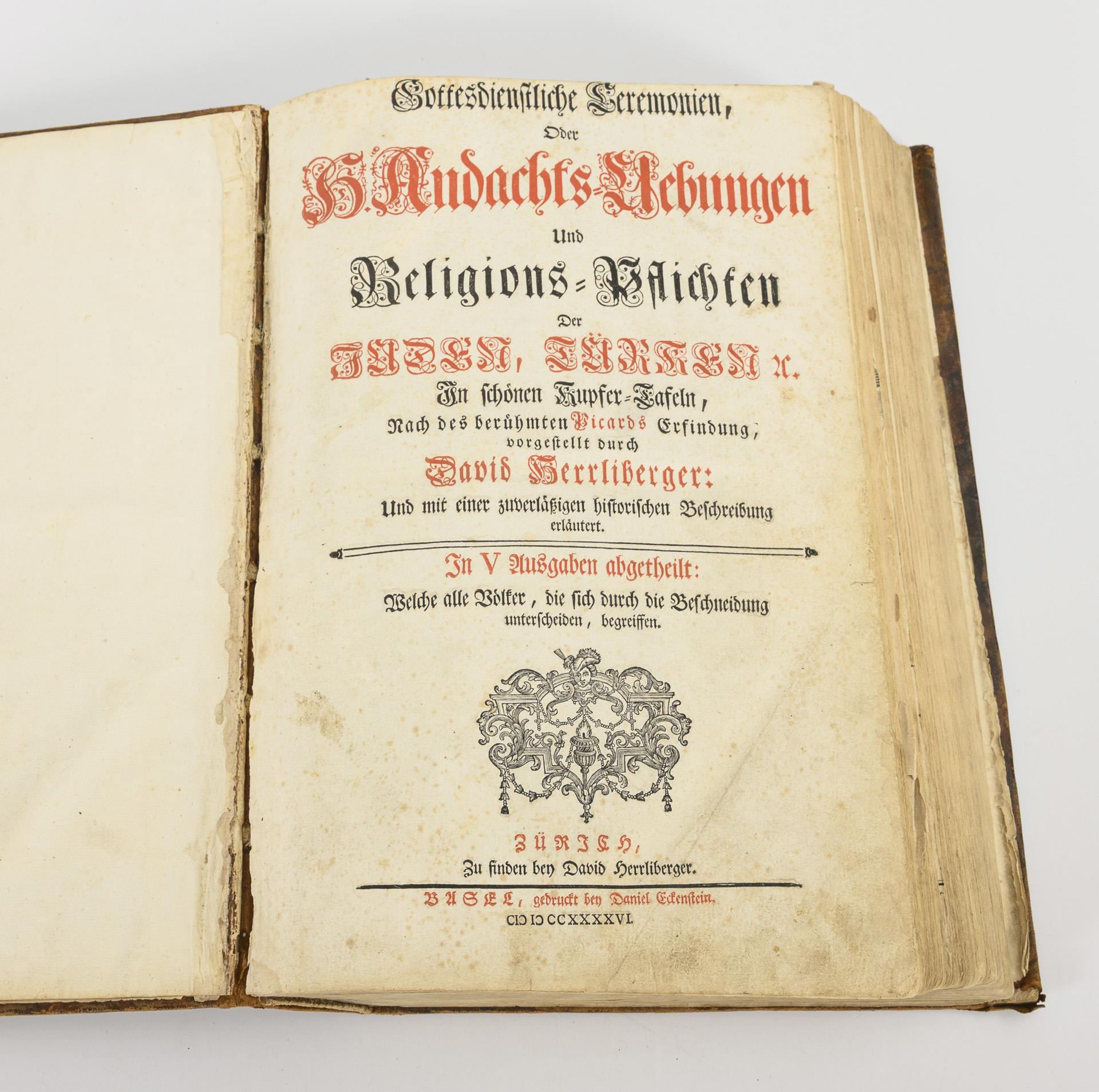 Heilige Ceremonien, Gottes- und Götzen-Dienste aller Völcker der Welt, Oder Eigentliche Vorstellung und summarischer Begriff, der vornehmsten Gottes-Dienstlichen Pflichten, Kirchen- und Tempel-Gebräuchen, der Christlich- und Abgöttischen Völcker der gantzen Welt, Welche Nach des berühmten Picarts Erfindung in Kupfer gestochen, und verlegt worden HERRLIBERGER, David. Verlag: Zürich, Getruckt, in Bürcklischer Truckerey Anbieter: Antiquariat Burgverlag, Wien, Österreich Verbandsmitglied: ILAB VDA VDAO (Verkäufer mit 5 Sternen) Verkäuferbewertung 5 von 5 Sternen5 Sterne, Erfahren Sie mehr über Verkäufer-Bewertungen Verkäufer kontaktieren Gebraucht EUR 5.400,00 EUR 12,00 für den Versand von Österreich nach Deutschland Anzahl: 1 verfügbar 5 Tle. in 1 Bd. [Verlegts David Herrliberger, Basel, gedruckt bey Daniel Eckenstein 1739-48]. 2°. 16 S. (Erklärung d. Kupfertitels), 27, 40, 22 [2], 18, 85 [1], 198, 217 S., 1 Bl. (Vorrede), 19 Bll. (Register). Mit gestoch. Frontispiz u. gest. Portrait Picards sowie 227 (teils gefalt. od. doppelbl.-gr.) Kupfertaf. Mit 6 gest. Tit. u. 5 Tit. in Rot u. Schwarz. Ldr. d. Zt. über 7 Bünde. Mit Rückensch. u. reicher Blindpräg. In ausgezeichnetem Zutand. Lipperheide Oc 25; Graesse II, 104 (frz. Orig.-Ausg.); Sabin 31581; Rümann 429 - Gesamtausgabe der von Herrliberger besorgten deutschen Ausgabe des Monumentalwerks der "Ceremonies et coutumes réligieuses." mit neuen, von Herrliberger nach den Picartschen Originalen gestochenen Kupfern. - Teil 5 behandelt die Völker Asiens, Afrikas u. Amerikas (Indianer). "Mit seinen Darstellungen erreicht das Barock in der zürcherischen Buchillustration den Höhepunkt . Besonders verdienstvoll ist Herrlibergers . Wiederveröffentlichung des kulturgeschichtlich bedeutsamen Tafelwerkes . Dieses Werk ist eine ganz bedeutende Leistung der Kupferstecherwerkstatt Herrlibergers und stellt der zürcherischen Buchillustrationskunst dieser Epoche ein ruhmvolles Zeugnis aus. Picard hatte dieses Monumentalwerk erstmals 1745 herausgegeben und damit eine wahre Fundgrube für religionswissenschaftliche Studien geschaffen" (Leemann-van Elck). Tl. 2: Gottesdienstliche Ceremonien, Oder H. Kirchen-Gebräuche und Religions-Pflichten. Tl. 3: Gottesdienstliche Ceremonien, Oder H. Andachts-Uebungen Und Religions-Pflichten Der Juden, Türken Tl. 4: Eigentliche Beschreibung Der Auswendigen Gottesdienstlichen Kirchen-Gebräuchen und Gewohnheiten Der Juden, T. 5: Heilige Ceremonien, Oder Religions-Uebungen der Abgöttischen Völker Ohne das 1750-51 ersch. Supplement über die reformierten Kirchen der Stadt u. Landschaft Zürich, das in der franz. Originalausg. nicht vorkommt. Gewicht in Gramm: 8000. Details ausblenden
