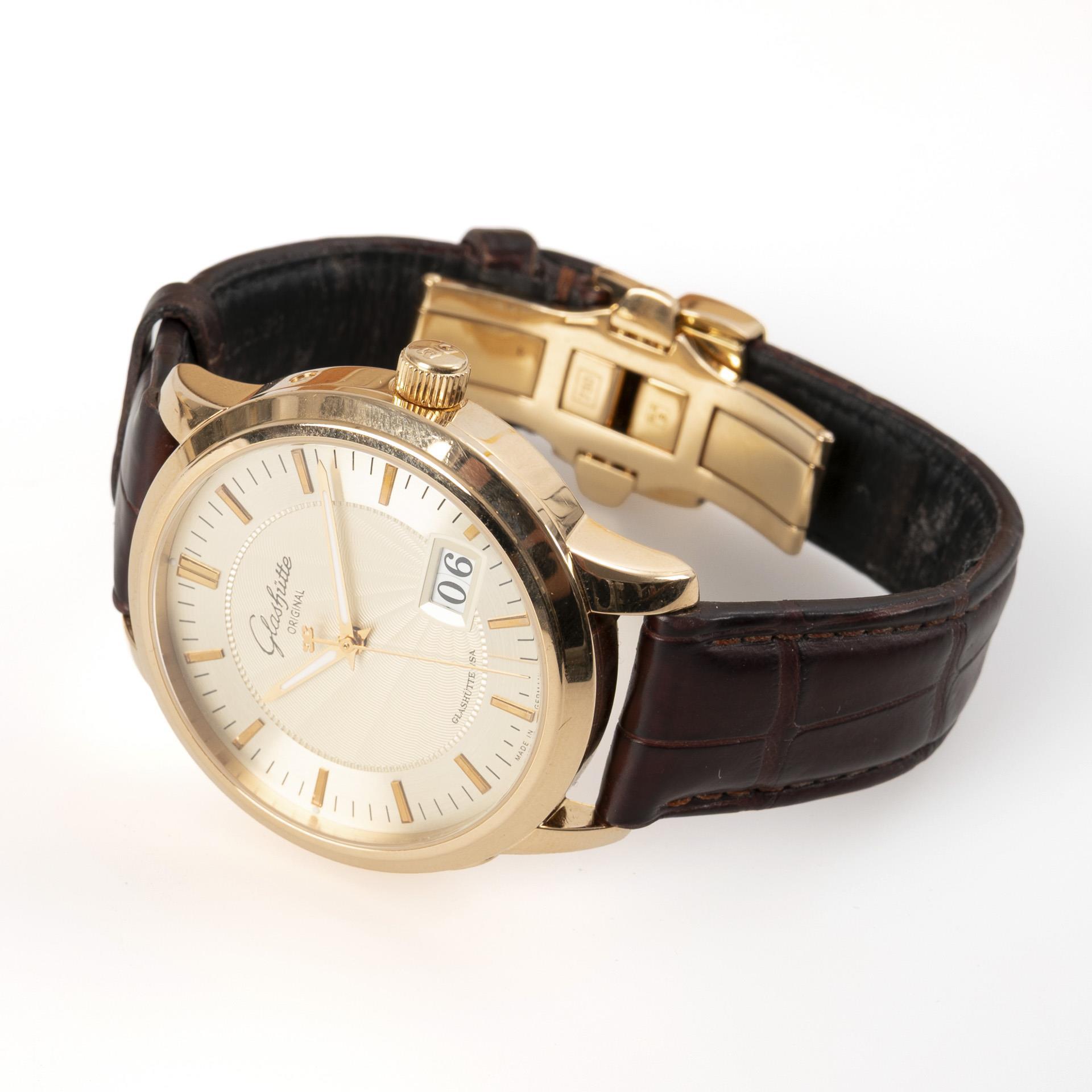 Golden automatic wristwatch "Senator" with panorama date, in original case. Glashütte Original, Glashütte i/SA.