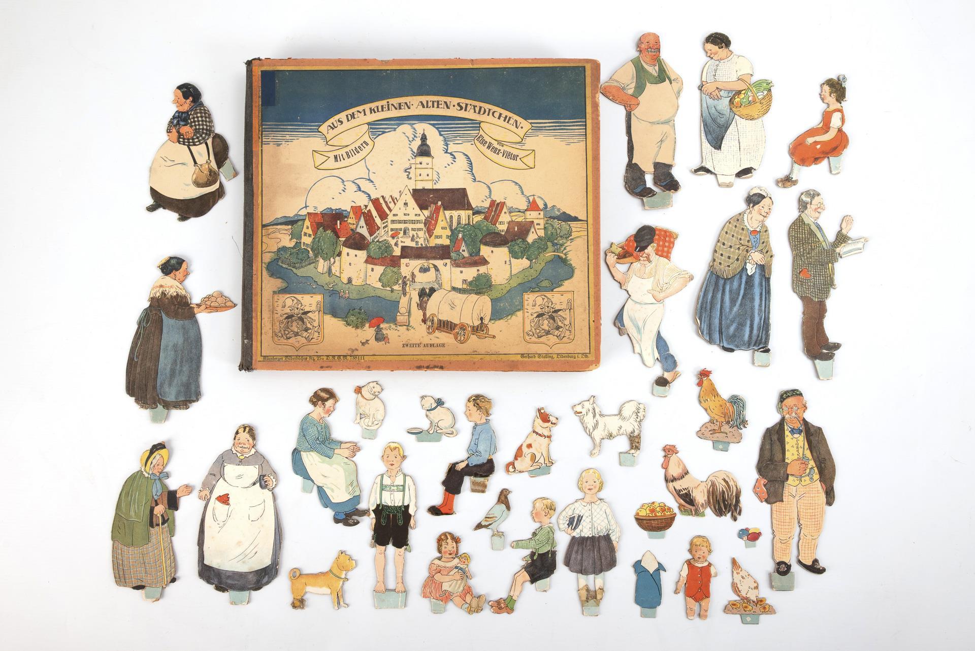 Beleg: ObjektbeschreibungWenz-Viëtor, Else, Aus dem kleinen alten Städtchen. 3. Auflage. Mit farblithogr. Titel, 7 doppelblattgr. Tafeln sowie 28 farblithogr. Einsteckfiguren . Oldenburg, G. Stalling [um 1925]. OHLwd. 28,5 : 35,5 cm. Nürnberger Bilderbücher , Nr. 25a. - Seltenes Steck- und Spielbilderbuch der bekannten Bilderbuchkünstlerin, das von der 2. Auflage im Oldenburger Stalling Verlag erschien. Die dekorativen und farbfrohen Doppeltafeln zeigen eine Postkutsche, Dorfstrasse, Bäckerei und Metzgerei, Wochenmarkt, Gasthaus, Kaufladen und Klassenzimmer. - Mit dem kompletten Figurensatz. - 1 Tafel mit Fehlstelle (3 : 4 cm), 1 Falz innen mit Platzstelle. Rücken mit kl. Einriß. - Figuren insges. sehr gut erhalten, 3 mit kl. Beschädigungen. Reetz 18. - Vgl. Liebert 27 (EA von 1923 und 2. Aufl. 1923 als Leporello); Stuck-Villa II, 349 (2. Aufl.). - Nicht bei Klotz, Schug u. a.