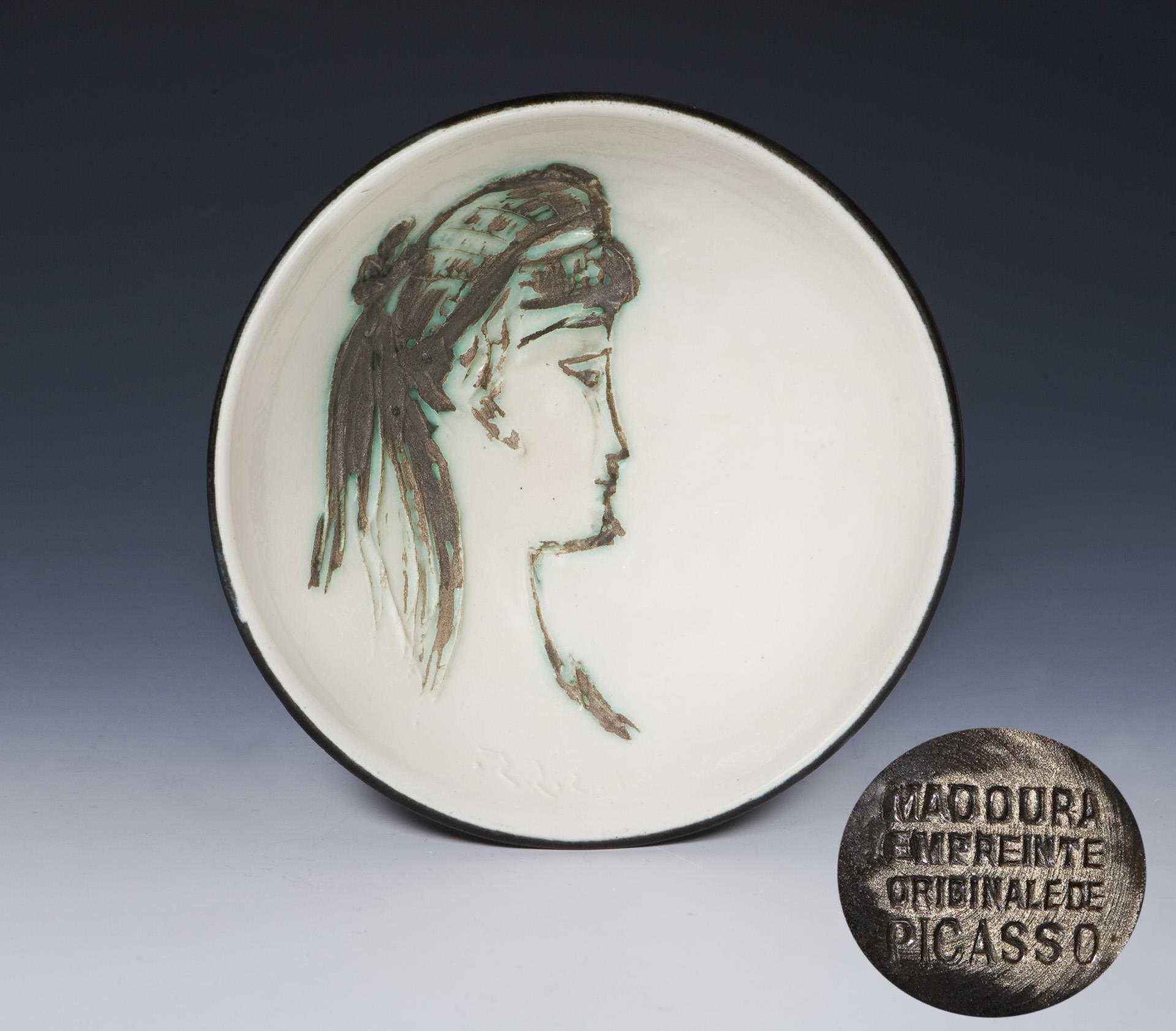 Sylvette David (* 1934 Paris) diente Picasso als Modell für diverse Gemälde, Zeichnungen und Skulpturen. Enwurf: 1955, Auflage: 100 Exemplare. Frontal cremefarben, rückseitig schwarz glasiert, Bemalung in Braun und Grün. Tiefgemuldete runde Form. Prägestempel Empreinte Originale de Picasso, Madoura, innen im Relief datiert: 31.3.55