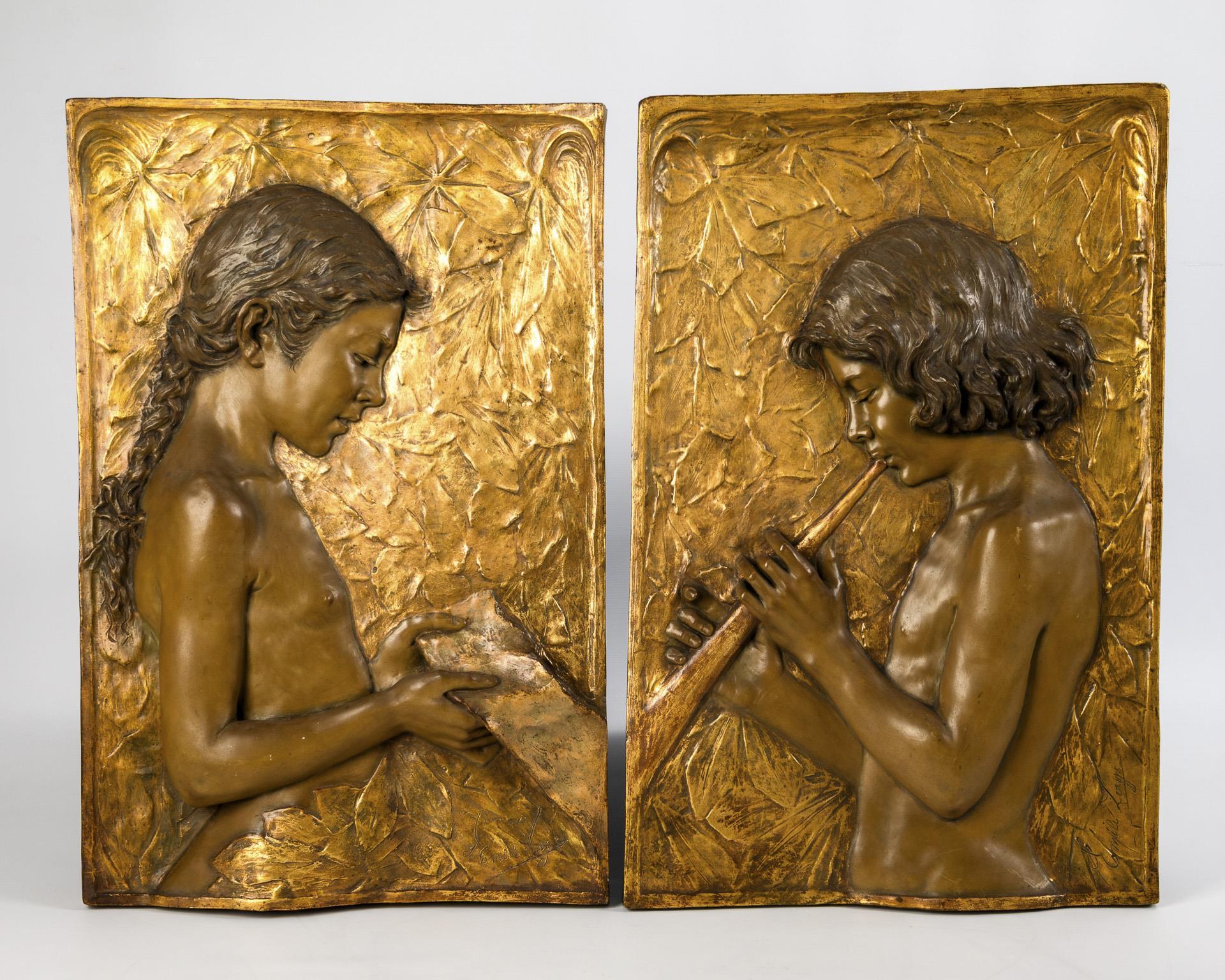 2 Art Nouveau wall relief panels with children's motifs. Viennese manufactory Friedrich Goldscheider.
