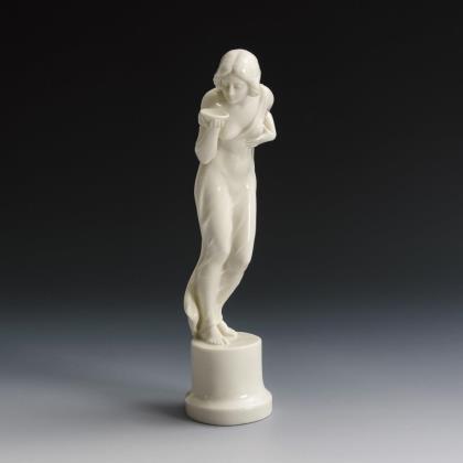 Auf einem Postament stehende, aus einer Schale trinkende junge Frau