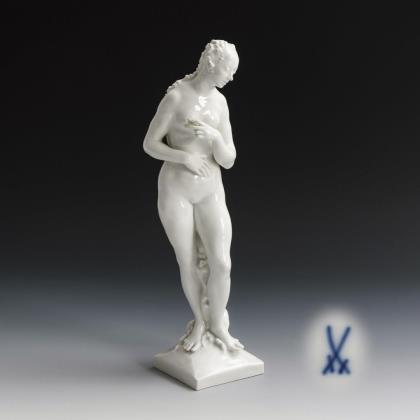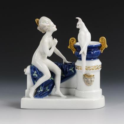 Auf einer Steinbank sitzende, nackte Rokokodame, mit einem auf einem Vasenrand sitzenden Kakadu sprechend