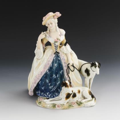 Rokokodame mit Hut, zwei Windhunde an der Leine führend