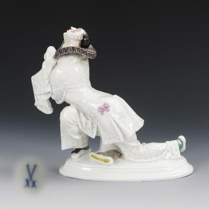 Im Ausfallschritt kniender, den Kopf in den Nacken werfender Pierrot