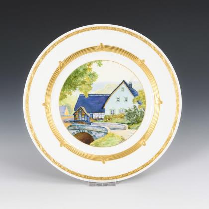 Teller mit goldbronzierter Bordüre und Steg. Im Spiegel die Darstellung einer Ortsansicht mit Brücke und Bauernhaus