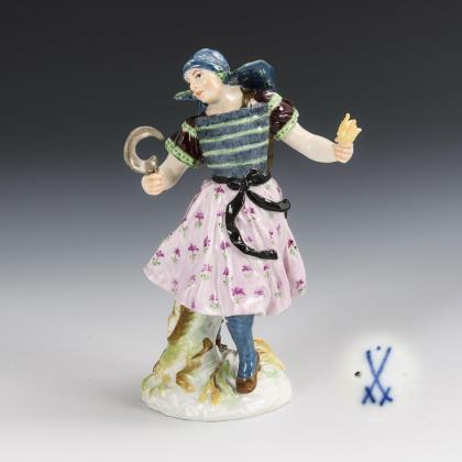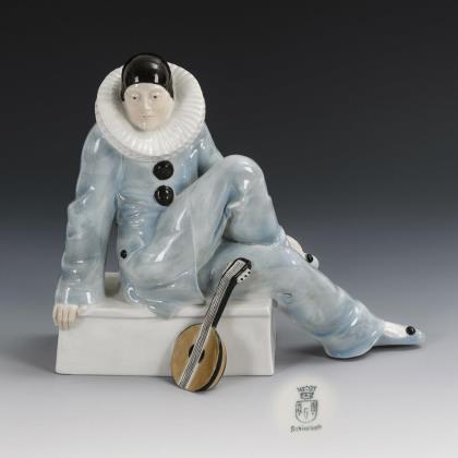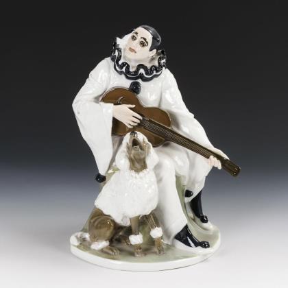 Auf einem Rasensockel sitzender, eine Gitarre spielender Pierrot mit "singendem" Pudel zu seinen Füßen