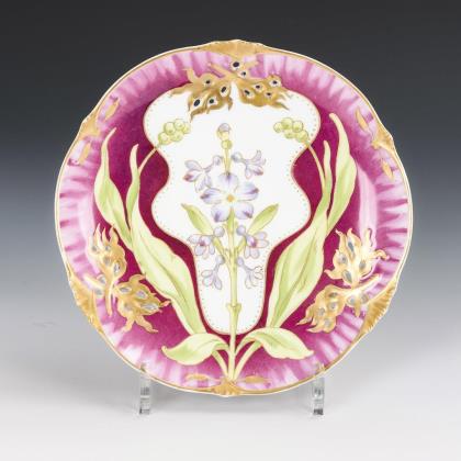 Mehrpassiger Durchbruchteller mit purpurfarbenem Teilfond sowie einer großen Pflanze im Spiegel