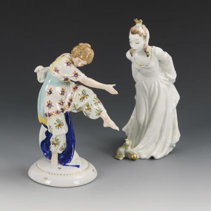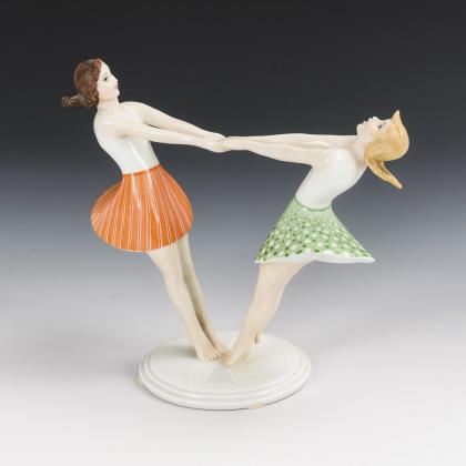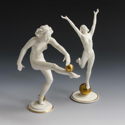 1x Tänzerin mit zwei Kugeln (Entwurf Carl Werner, bezeichnet). / 1x auf einer Kugel stehender Frauenakt