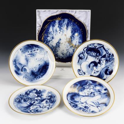 1x Wandteller "Winterwald 1992" (mit Zertifikat, im Originalkarton). / 4 Märchenteller, Entwurf Ukki Ukleya: "und das war die erste von tausendundeiner Nacht" (1981), "In den Gärten der Glückseligkeiten" (1982), "Der Kalif von Bagdad" (1983) und "und als der Morgen dämmerte hielt Scheherezade inne mit ihrer Geschichte" (1984)