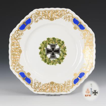 Oktogonaler Teller mit einem eichenlaubumkränzten Eisernen Kreuz im Spiegel, auf der Fahne goldene Ornamentmalerei