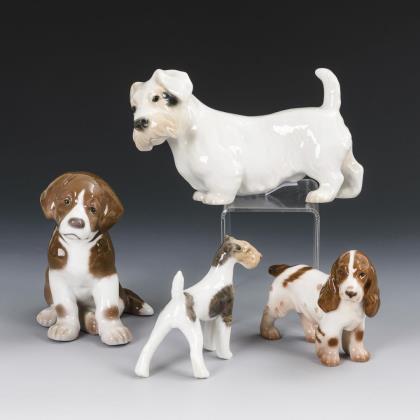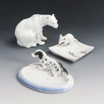 1 Müller/Schwarza: Ascher als quadratische Schale mit einer am Rand sitzenden Maus (10,5 x 10,5 cm). / 1x Pfeffer/Gotha: ovale Schale mit einem auf dem Rand sitzenden Setter (L 16,5 cm). / 1x ENS: sitzender Eisbär