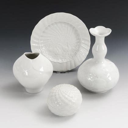 1x Vase "Lotusrelief", Entwurf Ludwig Zepner (H 20 cm). / 1x bauchige Vase (H 12 cm). / 1x Dose mit Vergißmeinnichtblütenrelief (H 8 cm). / 1x Teller mit Schwanenservice-Reliefdekor (Ø 20 cm)