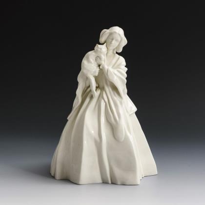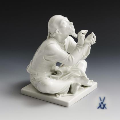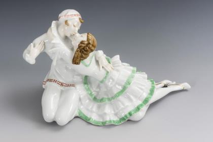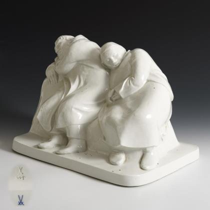 Seltene, weiße Ausführung des auf einem Steinsockel sitzenden, sich aneinanderschmiegenden schlafendes Bauernpaares
