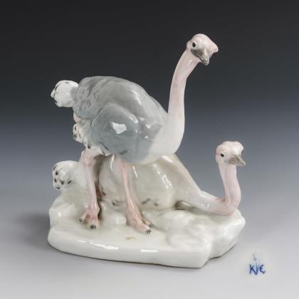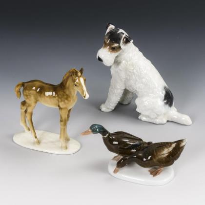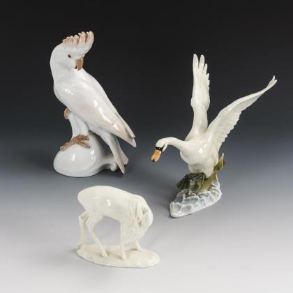1x Rosenthal, 1928/29, Entwurf Theoder Kärner: Auf einem Astsockel sitzender Kakadu, unterseitig bezeichnet "Sylvester 1928-29 Hotel Bristol Berlin" (H 26 cm). / 1x Nymphenburg, 20. Jh., Modell-Nr. 836, Entwurf August Göhring, 1938: stehender Rehbock (H 11,5 cm). / 1x Hutschenreuther, ab 1955, Entwurf Hans Achtziger: Von einer Wasserfläche auffliegender Schwan