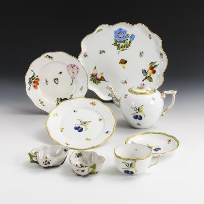 Teekanne (H 15 cm), 8 Teetassen, 3 + 9 Untertassen (Ø 13,5 und 15 cm), 4 Mokkatassen mit 4 Untertassen, 2 + 3 + 4 + 4 Teller (Ø 14-18 cm), 1 + 3 Suppenteller, 5 Speiseteller, 1 Gemüseteller (Ø 32 cm), 1 Ovalplatte (L 34,5 cm), 1 Sauciere, 3 Schüsseln (Ø 24,5 und 28 cm), 1 + 2 Zuckerdosen (H 10 und 11 cm), 1 Stövchen 1 Kredenzschale mit Seepferdchen, 1 Muschelschale, 1 Kraterbecher, 2 kleine Vasen, 3 Gewürzstreuer, 4 Muschelschälchen und 2 Tellerchen