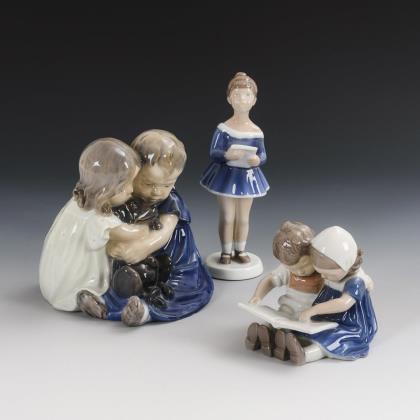 Bing & Gröndahl: Lesendes Kinderpaar (H 10 cm) und singendes Mädchen (H 18 cm). / Royal Copenhagen: sich umarmendes Kinderpaar mit Dackel (H 14,5 cm)