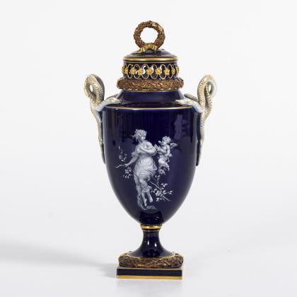 Ovoider Korpus mit zwei gewundenen Schlangenhenkeln sowie durchbrochenem Deckel mit Eichenlaubkranzknauf. Schauseitig die fein gemalte Darstellung der Venus mit Amorknaben, verso drei über einer Wolke stehende, musizierende Putten