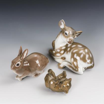 Royal Copenhagen: liegendes Rehkitz (H 12 cm) und spielender junger Bär (H 6 cm). / Bing & Gröndahl: sitzender Hase (H 9,5 cm)