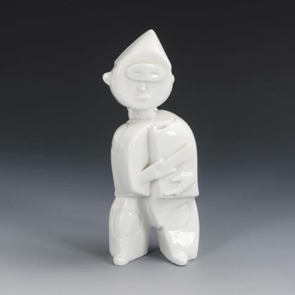 Abstrakt gestaltete männliche Figur mit Fächer und spitzem Hut