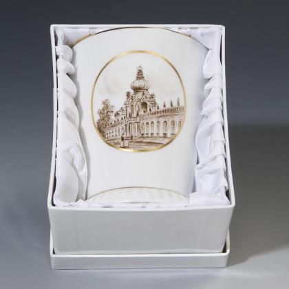 Gefußte Glockentasse mit Palmettenhenkel. Goldfond auf der Innen- und Außenwandung, schauseitig eine Rechteckkartusche mit der bezeichneten Ansicht des Altenburger Schlosses