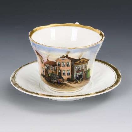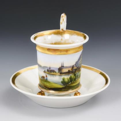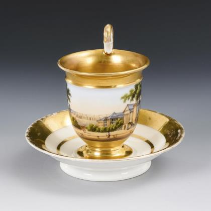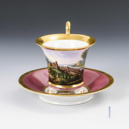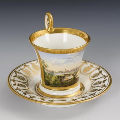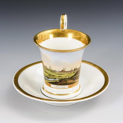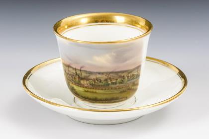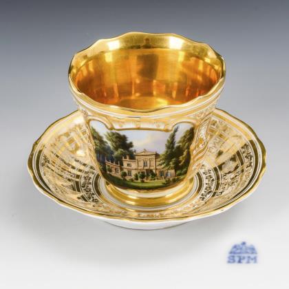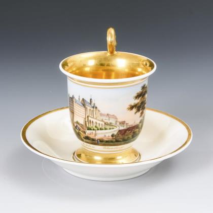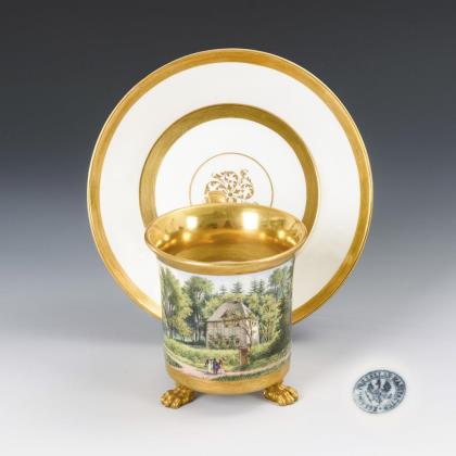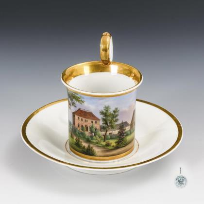 Breite, gefußte Kratertasse mit gewinkeltem Henkel. Schauseitig eine goldgerahmte Rechteckkartusche mit der Ansicht eines Dorfes mit Teich und Kirche, im Spiegel der Untertasse die Ansicht eines Schlosses