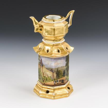 3-teilig. Oktogonale Form. Kännchen mit Goldfond und Perlband. In Form einer Pagode gestaltetes Stövchen mit bezeichneten Ansichten (Schloss Malmaison, Haverton)