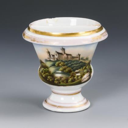 Große Glockentasse mit Ohrenhenkel. Schauseitig eine Rocaillekartusche mit der Ansicht eines kleinen, in einem Park gelegenen Schlosses, verso floral-ornamentale Goldmalerei, innen vergoldet