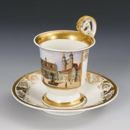 Gefußte Kratertasse mit Greifenkopfhenkel. Schauseitig eine goldgerahmte Rechteckkartusche mit der unterseitig bezeichneten Ansicht des Marktplatzes mit Lutherdenkmal in Wittenberg