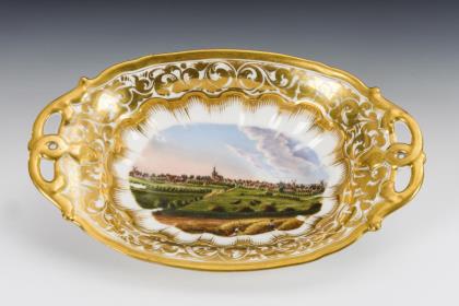 Form-Modell von Johann Jacob Irminger um 1725. Dekor-Nr. 593893. Frontal Goldreserve mit minutiöser Camaieumalerei "Dresden" nach einer Vorlage von Canaletto (1721-1780). Umlaufend farbig gemalte indische Blumen und Insekten. Reliefiert, gold staffiert. Pressmarken, Malermarke, Schwertermarke, goldene Schriftzüge