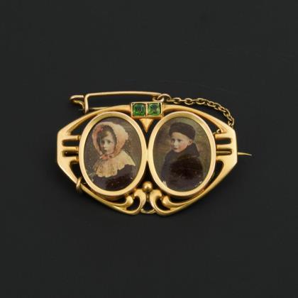 Stiltypische Brosche mit Doppelporträt-Rahmen und 2 grünen Imitationen. Original-Fotos von Kinderpaar. Hakenverschluss und Sicherheitskette mit Nadel