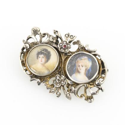 2 gerahmt verglaste Damenminiaturen in floralem Rahmen. Kugelhaken