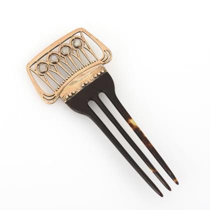 Stiltypisches Zierteil mit 4 zargengefassten Mondsteincabochons, an 3-zinkigem Kamm (Schildpatt?)