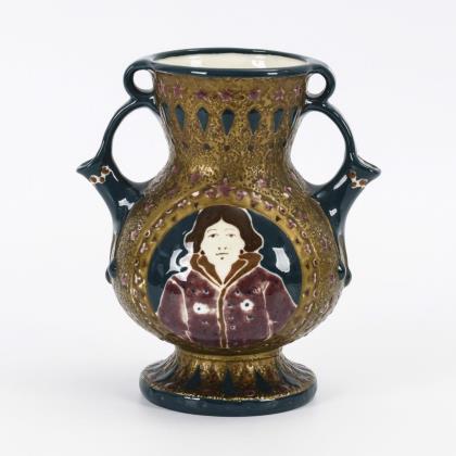 Doppelhenklige Ziervase mit ornamentalem Reliefdekor und der Darstellung einer Frau und eines Schwans auf petrol- und goldfarbenem Fond