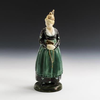 Stehendes Mädchen in Gmundner Tracht, mit Bibel und Rosenkranz. Auf Rundsockel