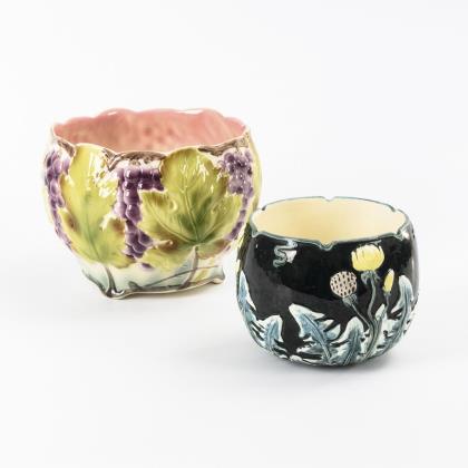 Bauchige Reliefgefäße mit Traubendekor (H 19,5 cm, Ø 22,5 cm) und Löwenzahn (H 15 cm, Ø 16 cm)